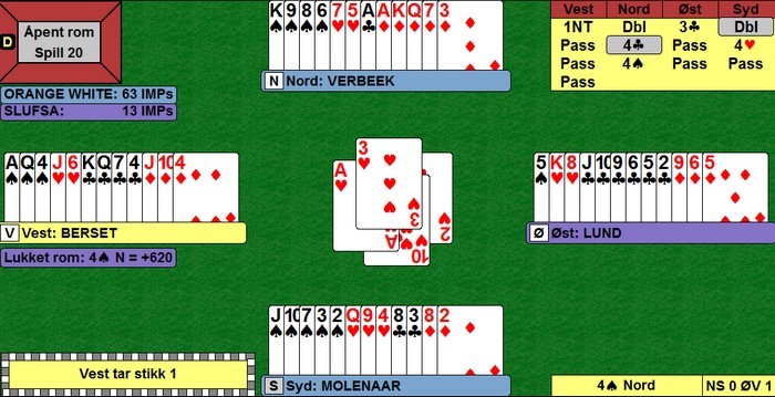 Når en skal ta igjen over 30 IMP på 14 spill, må en håpe på fordelilngshender. Derfor 4ru fra Ole, men det kosta -800. Godt forsøk og ikke verre enn 4 IMP ut mot 4sp hjem på det andre bordet.