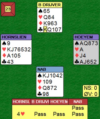 Sagt på BBO: "West was prepared to defend 4H until his partner told him it was going down." Aksel har gjort mye bra i denne kampen og nok en gang gjør han et godt valg når han tar ut 4hj dobla. 4hj vinnes kjapt ved å kappe ruteren gjennom NT-melderen. Uansett et tapt spill for Hornslien - Høyem i det syd meldte 4h og Ole - Børre slapp hjem 3NT. På hjerterkongen mot 3NT la Børre knekten. Øst dukka og Ole fortsatte med damen i håp om Kn10 blokk. Nå ble det ni stikk.