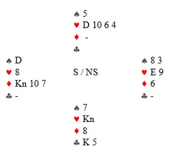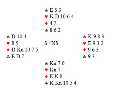 Ole tenker omtrent slik, tipper jeg. "Makker har KDxxxx i hjerter og en honnør til. Er det kløverkongen, står 6hj hvis kortene sitter sånn nogen lunde. Makker kan også mangle kløverkontroll, men hvis jeg cuebidder 4ru vil det fortelle motparten at de skal spille ut kløver. Jeg kan spørre etter ess, men selv om jeg får KD i hjerter og kløveresset, trenger det ikke stå 7hj. Makker kan ha singel spar og da må den fargen fort sitte 3-3. Det er for dårlilg odds. Det er ikke veldig sannsynlig, men makker kan ha singel kløver."