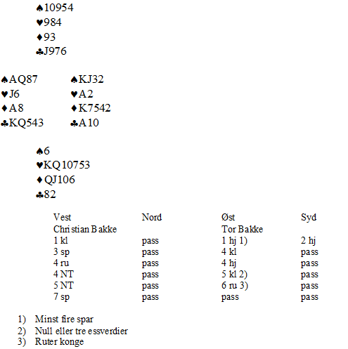Flere spillere kom i 7 spar, som er forholdsvis hardt meldt, men juniorspilleren Christian Bakke var den eneste som spilte hjem storeslemmen. Etter hjerter ut til esset fulgte spar konge og ess som, avslørte 4 – 1-sitsen i trumf. De fleste spilte nå på 3 – 3-sits i ruter, men ble overtrumfet og gikk opp til to, tre beter. Christian fant imidlertid en mer sjanserik spilleføring.
