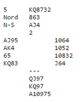 Det som skjedde nå var at spillefører ba om "åtte" fra bordet, men Espen i øst hørte "opp". Han fulgte på med sin femmer under åtteren og nå sto plutselilg 3NT med 2 + 2 + 4 + 1 = 9.