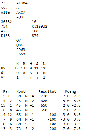 Erik og Steffen Fredrik meldte seg fint opp i 6 kløver på det andre bordet. Sistnevnte spilte fint da han garderte seg mot både 4-1-sits i trumf og sursits i spar. Han stjal to rutere på den korthånda og sikret dermed 12 stikk. 1370 mot 500 gir 13 IMP til Norge.