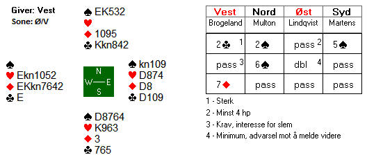 Lindqvists dobling er advarsel mot å melde videre. Likevel ser Brogeland at det ikke skal mye til for at det står storeslem. Hjerter konge og trekorts ruter hos makker kan være nok.