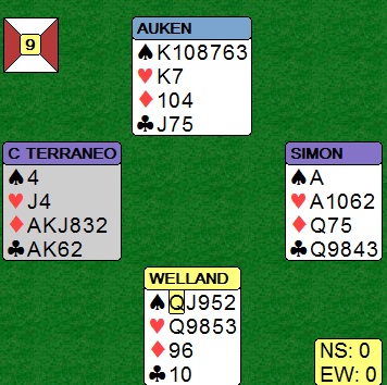 Ruter ut og skift til hjerter som Jørn vant med damen for å ta finesse i kløver som tapte til kongen. Ny hjerter kom så til kongen og så var det å planlegge bra nok, hva ville du gjort? Jørn satset på trumfkorting av Ø-V og med spill av kl D og ny kløver fikk Øst for sp 4 mens Vest kunne sake sin siste hjerter. Da hjerter kom til trumf i Vest var skift til ruter A ikke godt nok lenger. Sp 4 tok stikket og på sp A og K fulgte både Øst og Vest pent på og resten sto! 9 stikk og 140 inn ga Jørn og Egil +10 som var nest topp.