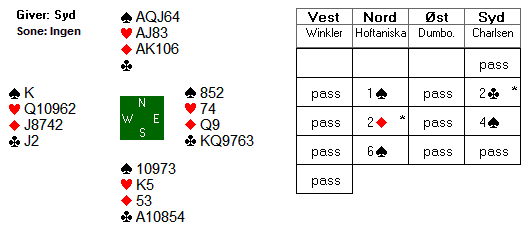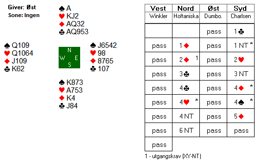7 NT er opplagt mest sjanserik, men i FBK tirsdag klarte bare Evensen- Simensen og Saxegaard- Helgesen å melde storeslem.De andre kom i 6 grand. Gunnar og Ragnar meldte på sjanse mens Atle og Arild hadde 100% kontroll. Problemet er å få klargjort at man har 13 stikk!