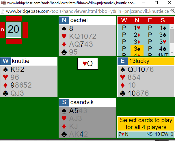 På grunn av at alle de uteværende honnørene i svartfargene sitter i nord er det mulig å vinne hele 13 stikk i hjerter. Men det er ikke bare bare å få meldt slem.