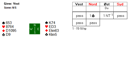 Anne Lene åpnet med 1 N i 2. hånd, Tom overførte til hjerter og over svar 2 hj fra Nord hoppet han til 3 NT. Bare to par spilte kontrakt i hjerter, resten spilte 3 NT.