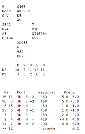 9 bord i 7 NT, 9 i 7 hjerter, 7 i 6 NT og 6 i 6 hjerter. Det er vrient å avdekke at det er «13 ess», kl D i Øst gir siste stikk, men 7 hjerter bør ha god sjanse. Syd hadde sp D95- hj 10- ru K73- kl J109742