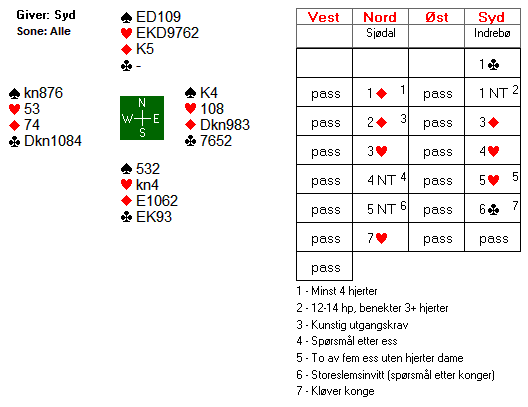 "Grunnen til at jeg meldte 4kl og satte ruter som trumf var fordi jeg var interessert i å vite om Sofie hadde ruter kongen når jeg spurte i 4NT i tilfelle det sto 7sp."