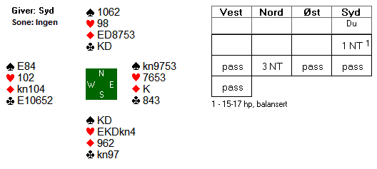 Du har ikke inntak til bordet utenom ruteren og risikerer å få bare to stikk i farga på denne måten. Men det er etter alt å dømme nok. Teller du fem hjerterstikk og kløverstikket vi allerede har fått er vi oppe i åtte. Motparten må gi deg et svart stikk til og du kan notere vunnet kontrakt.