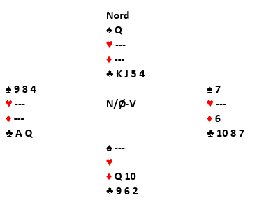 Muller vant med kløver ess andre gang og tok ruterstikkene. På den første fulgte jeg, og på den tredje ruteren la jeg kløver 10 fra 10-6 for å late som om jeg hadde igjen K-10. Så kom den siste ruteren, og nå måtte jo jeg (hvis det var slik at jeg hadde kløver konge) kaste en spar, kanskje fra damen tredje opprinnelig? De to sitsene Muller måtte velge mellom var med fem kort igjen: