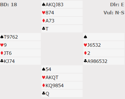 Du ser sikkert hva som skjedde med trumf i utspill! Min single ru J var eneste inntak til sp D som kunne gitt avkast av taper i kløver eller i hjerter. Med spar eller hjerter i utspill går 6 ruter enkelt hjem, og 2 par som fikk sp J ut vant 6 ruter. 4 andre par, 2 i 6 NT (av Nord) og 2 i 6 ruter ble betet. Hj K ut mot 6 NT bryter forbindelsen og 11 stikk er alt som kan vinnes. Mot 6 ruter beter også kløver ut til A og skift til ruter, men ellers går lilleslemmen hjem.