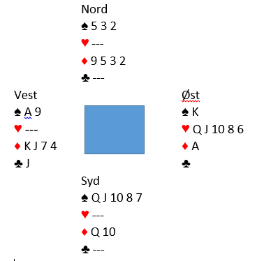 Kløver dame kom ut mot syds 4 spar. Det ga spillefører en sjanse selv om det unektelig ser ut som det er to tapere og ruter og trumf. Scwartz tok for A-K i kløver og kastet to ruter. Så stjal han en kløver fulgt a hjerter konge og hjerter til esset. Den fjerde kløveren ble stjålet hos syd, og da var dette igjen: