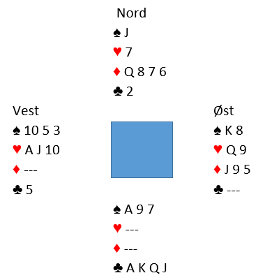 Så for at forsvaret skal ha en sjanse etter denne starten må vest stikke med spar dame og spille mer trumf. Den vinnes med tieren, og da ser det slik ut: