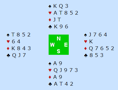 Jeg (Vest) spilte ut hj 7 (Norske kast, invitt mot grand), 8-er fra bordet (skape mulig illusjon) og 10-er fra Arne Marthinussen som Per stakk med damen. Hva ville du spilt på? Sitter minorfargene gunstig kan det bli lett, men problem og det ikke er gunstig sits. Per angrep i rett rekkefølge, spilte ruter til damen og kløver til damen som holt. På kl A la Marthinussen 10-er og kunne hatt kl K1094 men Vest hadde lagt 3 og så 5 og det tydet på 3-3 imot. Kl 2 gikk derfor til 9, J og K. Arne fortsatte med hj K, Per laserte korrekt og jeg la 2-eren. På hj D fra Øst vant A hos Rømoen mens Vest la 4-eren. Dette tydet på at Vest hadde spilt ut fra 4 små hjertere, med 9-er på topp. Nå fulgte ruter til esset der Vest la 8-er og Øst liten. På godspilte kl J sakte Arne sp 2 (3 kort eller styrke ?) og jeg sp 8 (svakhet?). Nå var 8 stikk sikret men på ruter til 10- K og sp 5 fra Vest hadde jo Øst igjen ru J som sto. To alternativer var nå aktuelle: Spille siste ruter og sette inn Øst som da ville vørt innspilt om sp A var der- eller spille spar som gir kontrakten om sp A er i Vest.