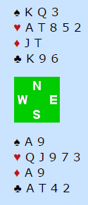 Anta Syd åpner med 1 NT, Nord bruker 2 kløver søk (Stayman) og Syd med 2 hjerter viser 4 (5) i den fargen. Nord avslutter med 3 NT og siden Syd ikke melder 4 spar har hun nepper 4-4 i major.