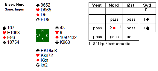 Spill 1 med N og ingen ga nesten standard doblet minorutgang. Nord åpner med 1 kløver hvis system har fargeindeks 5-5-4-2 eller 5-5-3-3 men med 1 hjerter om 5-4-4-3 brukes. Over 1 kløver melder Øst pass og Syd 1 spar før Vest melder ruter på passe høyt nivå. Da Nord- Syd har majortilpasning i begge farger vil de støtte hverandre, hos oss meldte Vest 4 ruter, men vi mente utgang var brukbart forsøk men Vest sikret med 5 ruter som da normalt blir doblet. Ved 6 bord skjedde det, hos oss hadde Syd doblet negativt, og bare hjerterfargen vist. 5 ruter er bet, men da må Nord klare å underspille sparen så Syd kommer inn og kan spille trumf opp og ødelegge for to stjelestikk. Nord kan ikke spille trumf for da ryker det sikre stikket der. +550 og score +9.
