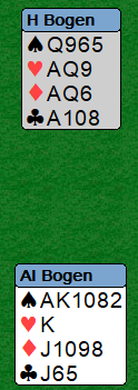 Siden det var parturnering satset en god del par på 6 grand, og de fikk betalt for satsingen da vest hadde ruter konge dobbel. Å notere +1470 ga +73 av 84 oppnåelige.
