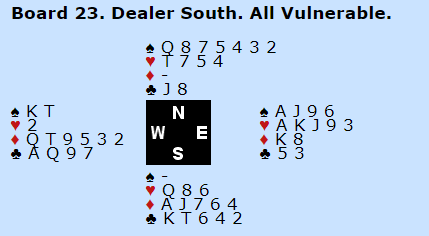 Bulgarias Ø/V meldte og støttet ruter før de havnet i 4 spar. Nord spilte ut hjerter 10 til syds ess. Nå må syd ha hatt en slags "brain-lapse" da han ikke så at det opplagte motspillet er ruter ess og ruter til stjeling - han jo vet at den skjulte hånden har rutertilpasning.