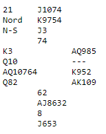 Nord passet de fleste steder (noen åpnet kanskje med Ekrens 2 ruter?), og etter standard system åpnet øst med 1 spar. Syd melder nok inn, flere steder kom 2 hjerter, svakt innhopp. På et vis hjelper det Ø/V litt, for når nå vest sier 3 ruter vet øst at det ikke kan være bare en firekorts farge som det jo kan være etter for eksempel starten 1 spar - 2 ruter. Nå sier nok nord 4 hjerter (minst), Det gjør det vanskelig for øst, men hvis makkerparet har 5 hjerter som Exlusion Blackwood i en sånn meldesituasjon så kan de kanskje finne storeslemmen. Vest viser ett Key-Card, og om det er det første svaret (ett stepp, 5 spar) så kan øst invitere til storeslem med 5 grand. Vest bør innse spar konge er et gullkort og har en sjanse bra til å kunne akseptere den invitten. Det er imidlertid ikke så lett etter så mye "bråk" fra N/S, og det viste seg også på resultatene. Kun tre par meldte 7 ruter, og to par var bare i utgang. Resten spilte 6 ruter med tretten stikk. Vinnerparet var i 6 ruter som ga -1, og toerne spilte i mot 6 ruter. Treerne, Fiplingdal-Tøsse var imidlertid ett av de tre som fant frem til den fine storeslemmen.