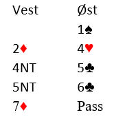 Makkerparet har nylig begynt å spille med 2-over-1 som utgangskrav, og det endrer enkelte varianter i de videre meldingene. En av avtalene deres er at om det går 1 i major - 2 i minor, så 4 hjerter fra åpneren så viser det støtte i minoren, en sterk hånd og renons i hjerter! Ved frokostbordet så Tøsse dette i "systemblekka" og tenkte: "ooops, her er det nok mulig å ende opp i 4 hjerter på 0-3 tilpass". Men da han nevnte varianten for Fiplingdal husket han også denne spesifikke avtalen. Så kom sannelig et spill hvor dette var superviktig. Østs 4 hjerter er altså renons. Resten var nesten plankekjøring via 4 grand - Key Card - og da øst viste 3 (eller 0) Key Cards gikk vest på med 5 grand som var storeslemsinvitt (viser at alle nødvendige Key Cards er på plass og trumfen er i orden). Øst viste kløver konge med 6 kløver, og vest kunne melde 7 ruter vel vitende om at den måtte være nedlegg.