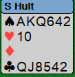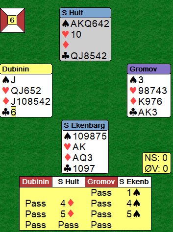 Idet Hult gikk på en gang til med 5 ruter så benektet han kløverkontroll, men sa også at han omtrent hadde resten dekket opp. Da åpneren slo av i 5 spar kunne ikke lenger slem stå, og Hult passet. Men slemforsøket kostet IMP da motstanderne stoppet i 4 spar, selv om det om du ser kun på N/S sine kort ser ut som 5 spar ofte vil stå. For slik det litt uheldig satt hentet Ø/V raskt en bet i 5 spar med kløver ut, A-K og kløver til stjeling.