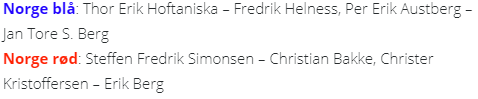 Norge stiller med spillere fra de respektive landslagstroppene. Espen Lindqvist – Boye Brogeland stiller ikke, de er etter det vi har bragt i erfaring opptatt på annet hold. Det er paret som vil være ankerparet for det norske landslaget i åpen klasse i 2018, og trolig i flere år fremover. De har imidlertid allerede etablert seg i verdenstoppen, og de får atskillig med matching ved at de deltar jevnlig i større internasjonale turneringer.