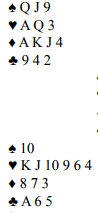 Mot oss var åpningen 1 spar i 4. hånd, svar 2 kløver fra Ø og hoppkrav 3 ruter fra V. Øst foreslo 3 NT men Vest valgte 4 spar som fikk stå.
