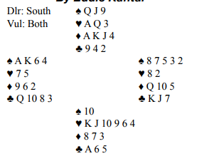 Ru D ble spilt ut i håp om at side stikk kunne reises. Vest stakk, tok for kl K og sendte hj J i vei til esset hos Bjørn Brovold. Trumf tilbake var «opplagt» og jeg fikk for damen. Ru J opp igjen og Vest vant men var nå uten direkte forbindelse med bordet som hadde tre stående stikk. På Sp A var Syd utsolgt, Nord måtte altså få 2 stikk til i trumf, men da jeg ble satt inn på siste (9-eren) hadde jeg jo bare hjerter igjen og Vest fikk sak for sine to små rutere.