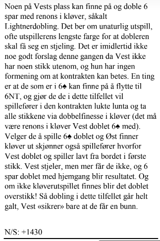 Da Harald S og jeg kom på at den kontrakten (6S) godt kunne bli doblet som Lightner (av Vest for å få kløver ut til stjeling) la vi på denne teksten: