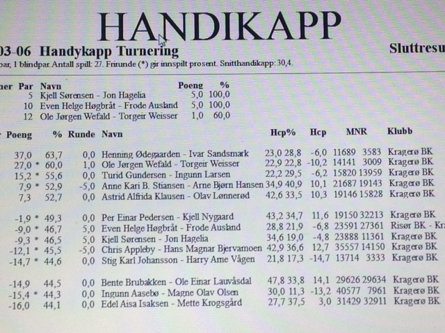 Her er resultatet etter handikapturneringen med HANDYKAP