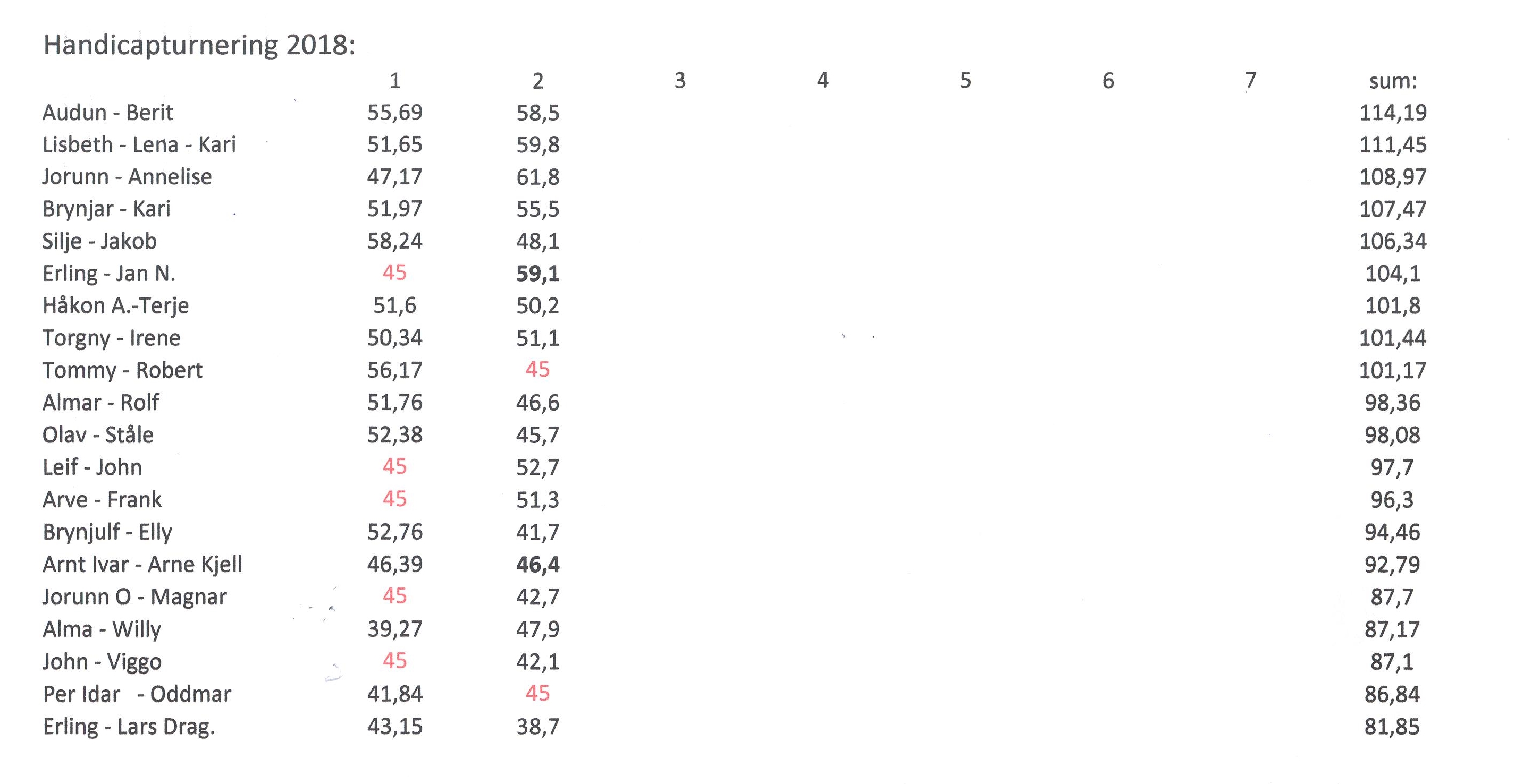 Bjørn og Simen hadde nemlig kommet helt skjevt ut i avslutningsomgangen. I runde 1 måtte de notere minus 20 mot Erling og vikarmakker Trond Rikstad før det ble et nytt tap, 4 minus mot Frank og Jan. Dermed kunne de se langt etter å forbedre sitt 6. beste resultat på 55,71.