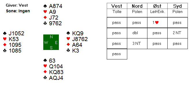Tolle spilte ut hjerter 5 (svensk fordeling), og nå var polakken redd for at øst kom inn på hjerter konge og skiftet til spar, og kunne sette opp 3 sparstikk, hjerterstikk og ruterstikk. Derfor stakk polakken opp med esset (Leif-Erik la styrke) og spilte kløver til damen som vant stikket. I stikk 3 fortsatte han med ruter konge, som øst stakk med esset. Nå kom det ny hjerter fra øst, og plutselig måtte polakken gjøre rett i hjerter for å vinne kontrakten!