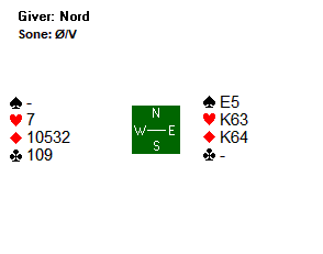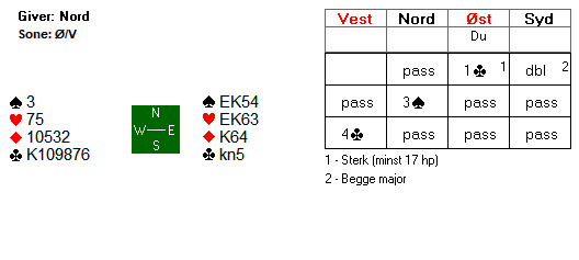 Peter balanserte i 3 kløver, og Tor meldte kanskje litt hardt da han hoppet rett i 5 kløver, men kortene passet perfekt sammen, slik at det kun var to rutertapere. +600 for Norge i åpent rom.