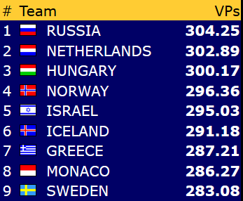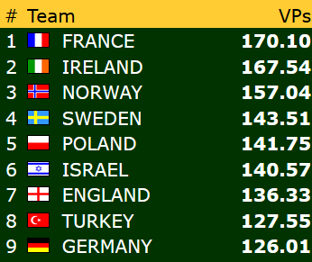 Norge vinner til slutt 44-26 og har i øyeblikket 13,53 VP ned til 4. plassen.