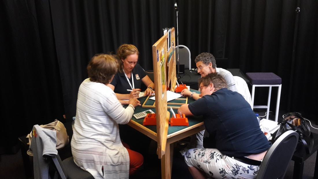 Belgierne kom først i 3 grand i lukket rom. Torild og Gunn Tove forsynte seg raskt med fem kløverstikk, og dermed ei beit. Nå håpet vi at Marianne og Ann Karin skulle unngå å havne i samme kontrakt, men dessverre endte meldingene med 3 grand også i åpent rom. Scoren 100 til øst-vest ga buttspill i kampen.