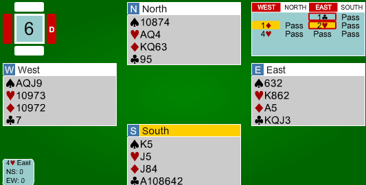 Som vi ser er 6 ruter en meget god kontrakt, som i praksis står så lenge trumfen løser seg uten taper.