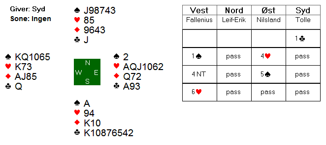 I lukket rom passet Heskje i 1. hånd, men da åpnet jo Rimstedt i Nord med 1 ruter* og Grønkvist i Syd svarte 1 hjerter. NÅ kom Vest innpå med 1 spar og Nord støttet makker med 2 hjerter- bud. Syd kom så på hugget, 4 kløver (splinter) og cue 4 ruter samt 4 spar fulgte. På 4 NT (5-ess) fra Nord kom svaret 5 ruter(0/3) og Nord kunne melde 6 hjerter. Bare få par var i lilleslem, de har jo bare 26 poeng men gode fordelinger.Med begge honørene i spar på rygg måtte jo ruterfargen oppføre seg skikkelig. Og det gjorde den, 3-2 imot og lilleslem sto som «høggen ved»! Spillet kostet 12 imp og snudde til svensk seier 27-40. Dermed tok Sverige føringen med Norge på flott 3. plass fortsatt. Tvi-tvi siste tre spilledagene for alle våre! De 8 beste i hver klasse er kvalet for VM senere i år.
