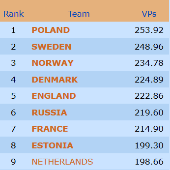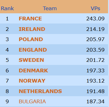 Onsdag kveld er registrert og bare 3 dager med spilling gjenstår før alt av ære, VM- kvalik m.m. er avklart. Så langt er Norge i tetskiktet i både åpen (4. plass), damer (3. plass) og Veteran (3. plass) og det er meget gode forhåpninger om å bli blant de 8 beste som går til VM- spill senere i år.