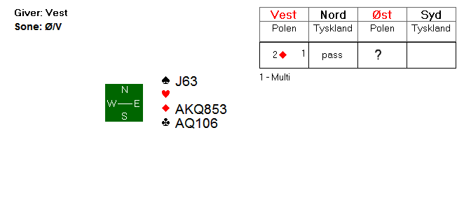 Dessverre var det de samme stikkene i grand-kontrakt, og franskmennene fikk faktisk meldt denne utgangen etter at Bessis oppvurderte østs hånd til en 20-21-NT. Volcker i vest tok seg ikke bryet å søle etter 5-kortsfarge i major hos makker. Han tenkte nok at veien ofte kan være kortere til ni stikk i grand enn ti stikk i majorkontrakt når han har ei trillrund hånd: