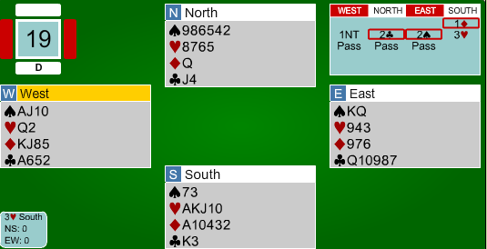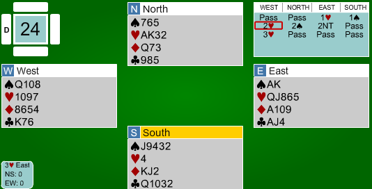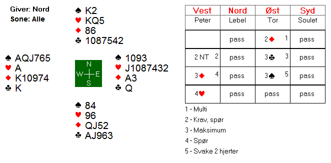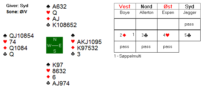 Etter 1 hjerter fra Espen, meldte syd inn 1 spar. Boye kunne meldt 2 kløver for å vise en god løft i hjerter, og fikk dermed vist omtrent 5-8 hp ved å melde 2 hjerter. Espen nøyde seg med en invitt, og da slo Boye naturlig nok av. I 3 hjerter var det to tapere i hver av de røde fargene. Dermed ni stikk.