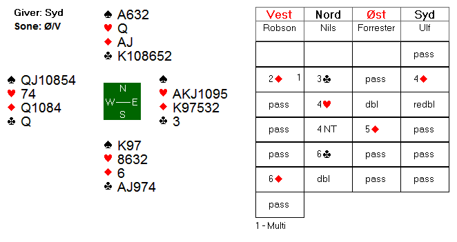 På tross av sur sits i spar, var det mulig å vinne kontrakten. Ulf fikk bra dreis på spilleføringa etter ruter ut til dama. Han fortsatte med en hjerter til dama og kongen. Øst fortsatte med kløver, som gikk via Ulfs dame til vests konge. Ny kløver gikk via tieren til esset. Deretter tok Ulf to høye trumf fra hånda. Da sitsen kom for en dag, spilte Ulf ruter til esset, og sendte hjerter knekt av gårde. Øst la liten, og Ulf slapp en minortaper fra hånda. Hjerter 10 fikk også beholde stikket, før nok en hjerter tok med seg esset fra øst. Ulf trumfet, og vest kunne gjøre hva han ville. Med bordets hjerter godspilt, var det ikke mer enn et trumfstikk for forsvaret.