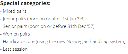 Spill 20 ga forøvrig utgangssving inn både for damene og veteranene også. Det var henholdsvis Marianne Harding og Peter Marstrander som spilte hjem kontrakten for våre to andre lag, mens deres respektive motstandere gikk beit. Dermed ble det altså 13 IMP til Norge i alle tre klasser på dette spillet. Akkurat slik vi liker det!