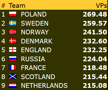 35-22-seier gjør at Norge får med seg 13,52 VP fra dagens siste kamp. Herlig med ei god avslutning!