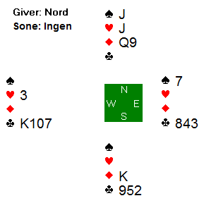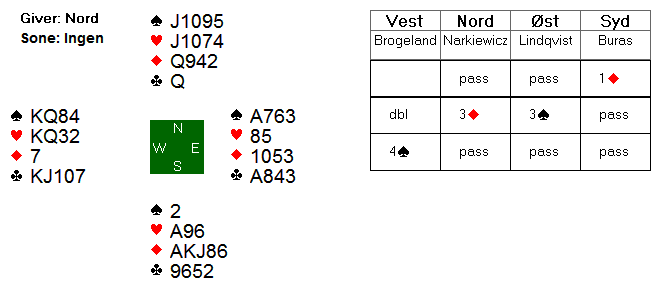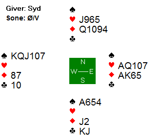 Arne Marthinussen og makker fant beste utgangskontrakt. Der passet Anne Langgård (N), Arne åpnet med 1 ruter, Herlov Langgård (S) gikk innpå med 1 hjerter og Vest krevde med 2 hjerter. Da Nord hoppet direkte til 4 hjerter tok Marthinussen med muligheten for sparkontrakt, og 4 spar fikk stå for 13 stikk. Mye bedre score enn utganger i ruter de fleste kom i.