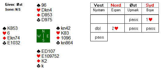 Utspillet var hjerter ess, noe som gir motparten sjansen til å hente fire beit. I løpet av spillet var Ulf inne for å begrense skaden til tre beit, men med den spilleplanen han til slutt endte opp med, ble det fire beit og 1100 ut. Det kostet 9 IMP da Boye og Espen spilte 4 spar med tolv stikk for scoren 680 ved det andre bordet.