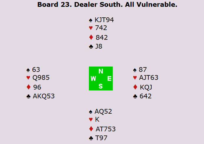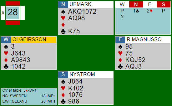 Vest kunne velge om han ville stjele over eller ei. Uansett ble det ikke mer enn to kløverstikk og ett stikk i hver av de andre stikkene for forsvaret. Dette spillet ga 13 IMP til Norge da Peter Marstrander og Tor Bakke spilte 3 kløver med ti stikk ved det andre bordet.
