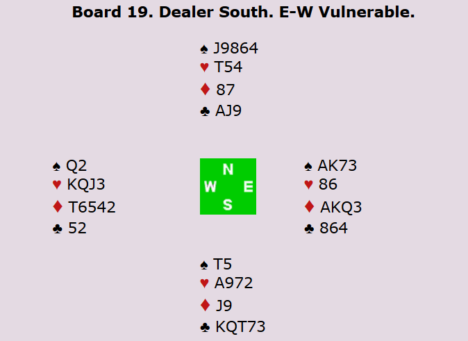 Ved det andre bordet tok Peter vare på sjansen han fikk i 3 ruter. Om nord finner kløver ut, må syd få fem stikk. Men uten gjennomspill i kløver, vil syd bli innspilt, og kan ikke få tak i mer enn fire stikk. Etter sparutspill ble det sågar ti stikk, og dermed 5 IMP til Norge.