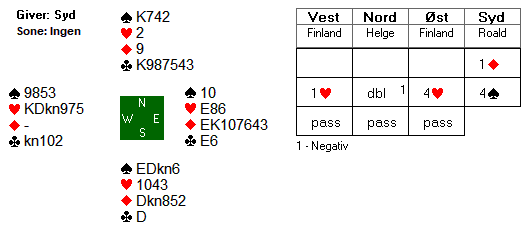 Her var Roald med til 4 spar, og fikk faktisk spille den kontrakten udoblet.To beit var billig moro da Tor Bakke spilte 3 grand med ni stikk ved det andre bordet. Dermed vant Norge 7 IMP på dette spillet. Det kan være flere oppsider med å melde 4 spar. Enten kan det stå, eller så kan det være en god stamp mot 4 hjerter.