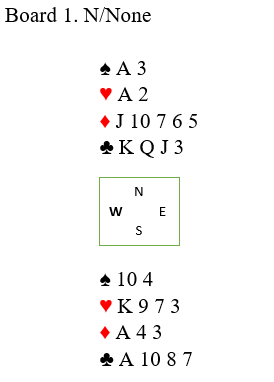 Jeg sa nesten, for du ser vel den ene feilen i dette diagrammet? Vest har igjen ett kort mer en de andre, og det er fordi han ennå ikke har kastet på den femte sparen. Hvis han kaster en hjerter vinner spillefører tre hjerterstikk til slutt, og hvis vest kaster en ruter kan spillefører tar for ruter ess og felle den siste ruteren og bruke hjerter konge som inntak til å hente godspilt ruterstikk. Men det satt ikke helt sånn, og kontrakten gikk bet etter at vest var flink og unngikk ruterutspill som ville forært spillefører kontrakten.